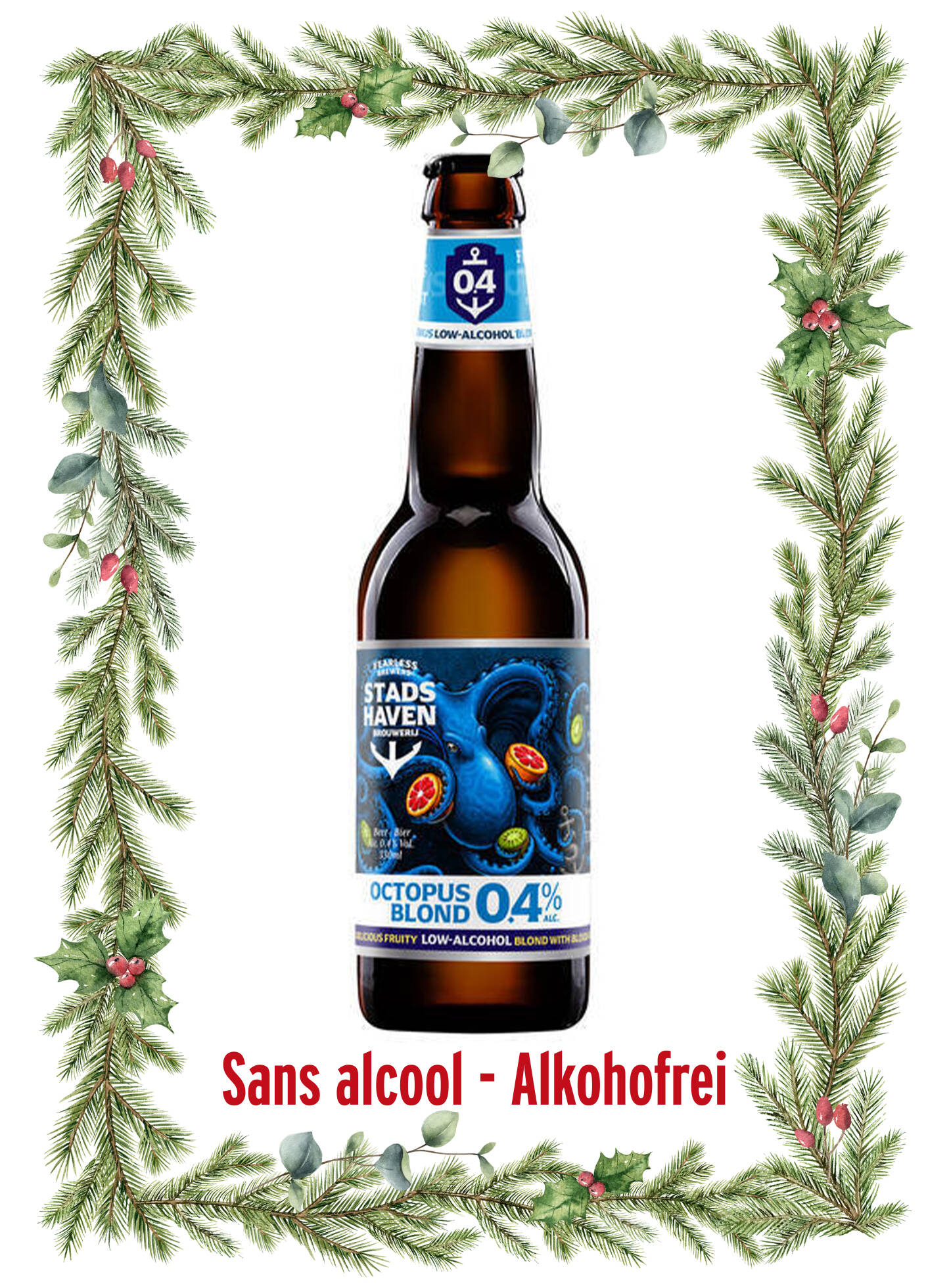 A smooth and bright non-alcoholic blonde beer, marked by light fruity notes and a delicately hoppy freshness. Lively and cheerful, it brings a clear and festive sip to the calendar, like a little golden wave that lights up December evenings.