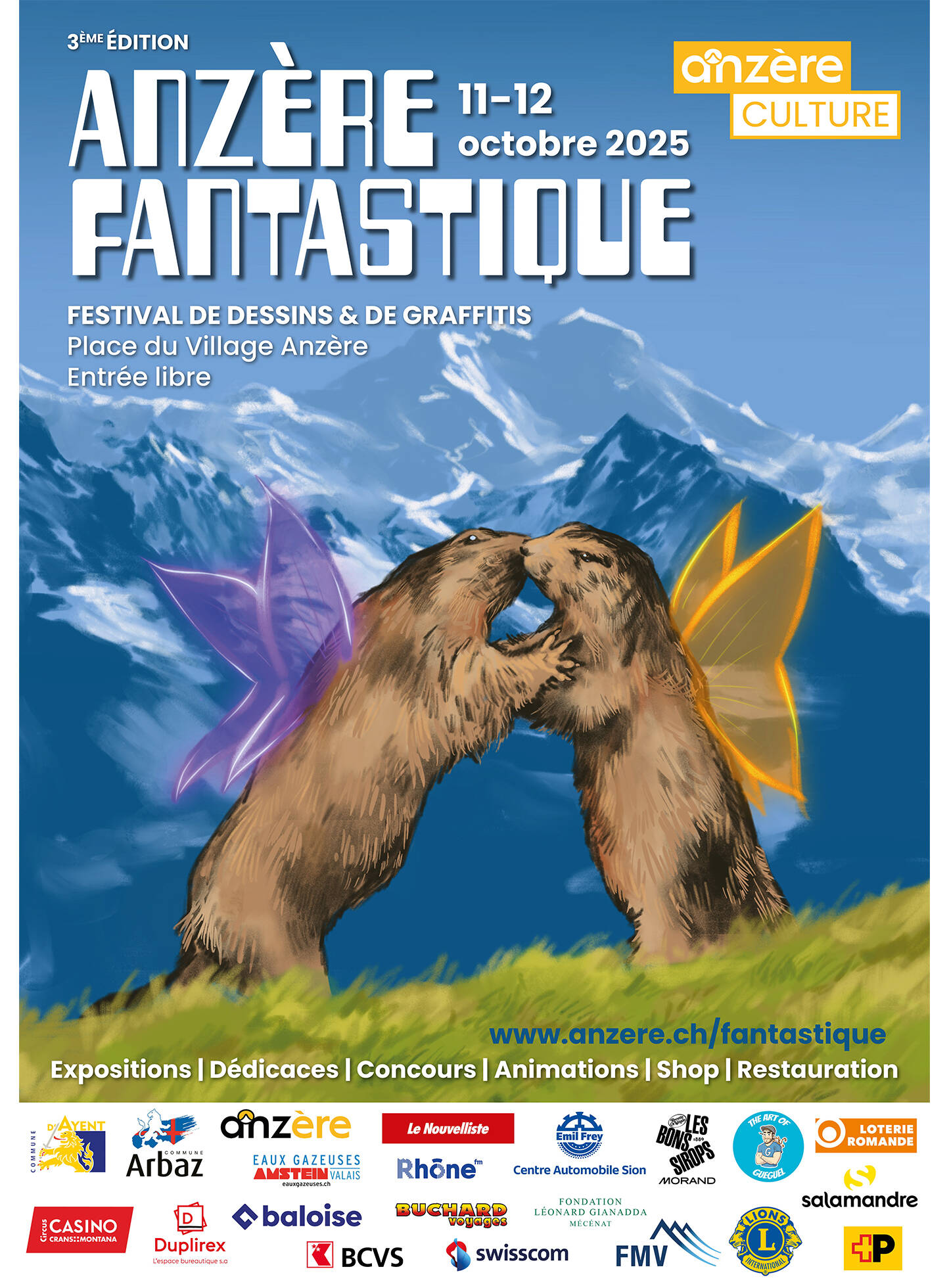 Découvrez le monde fantastique vu par des dessinateurs et graffeurs les 11 et 12 octobre 2025 à Anzère sur la Place du Village d'Anzère! Au menu, des démos, des ateliers et des animations gratuites pour toute la famille… Cette troisième édition sera portée sur la thématique des marmottes.